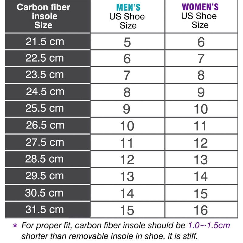 - For proper fit carbon fiber insert must be ¼ - ½ inch (approximately 1 cm) shorter than removable insert in shoe (because it is stiff), If in between sizes or half sizes round down to smaller size, and you should use this very-rigid insole below your original removable insole.