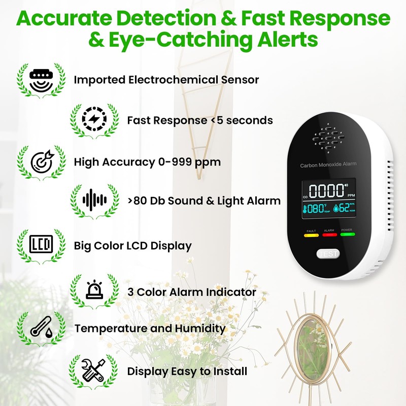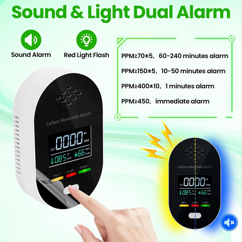 - 【Clear LCD Display & Sound and Light Warning】The carbon monoxide detector plug in comes with a high-definition display screen, achieving efficient real-time concentration monitoring and display,the high-definition screen makes it easy to read even at night; Designed with >85 decibel alarm sound and multi-color light alarm reminder, allowing you to react quickly and protect the safety of you and your family.