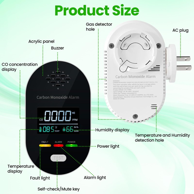 - 【High Precision and Efficient】This plug-in carbon monoxide detector comes with a high-precision Electrochemical sensor with extremely high resolution, enabling it to respond quickly and accurately detect indoor carbon monoxide concentration,to avoid false readings and false alarms.