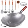 - WOK SET & RICH COOKWARES: You can get round bottom wok pan, wooden handle and steel helper handle, 1 x Wok Brush, 1 x Wok Ring,1 x Drain Oil Rack, 1 x Chopstick, 1 x Wok Spatula, 1 x Slotted Spatula,1 x Slotted Turner, 1 x Soup Ladle. Just having this multifunctional all-in-one wok, it will easily help you make better Asian food.