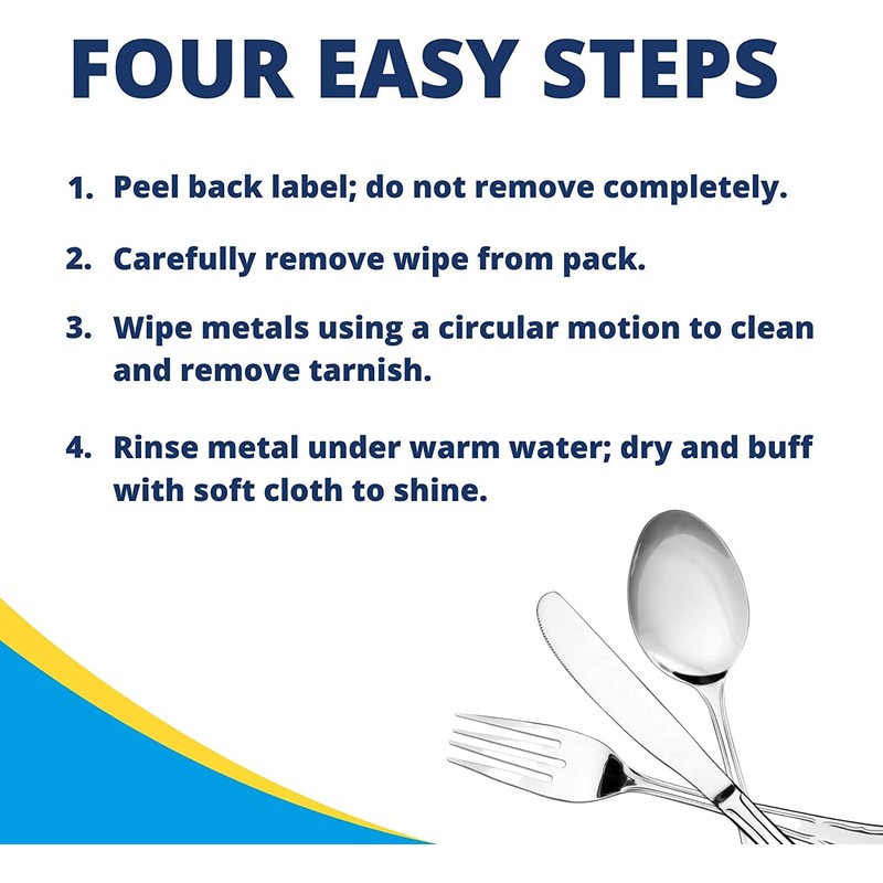 - SIMPLE INSTRUCTIONS: Peel back label; do not remove completely. Carefully remove wipe from pack. Wipe metals using a circular motion to clean and remove tarnish. Rinse metal under warm water; dry and buff with soft cloth to shine.