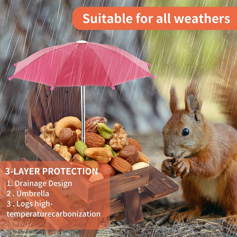 • SQUIRREL FEEDER TABLE WITH UMBRELLA: Our squirrel feeders for outside are equipped with a small 10.6-inch umbrella, which can quickly attracts squirrels and provides shade and protection from the rain, allowing squirrels to enjoy their picnics