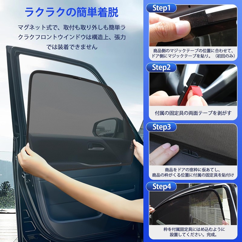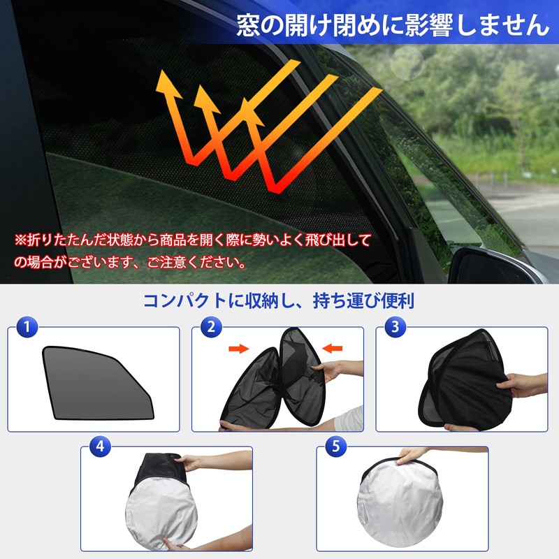 - (Magnetic, doesn’t interfere with window opening and closing) Features one-touch magnetic installation that anyone can install.It attaches magnetically, so it won't fall off when you open the door.When not in use, it folds up in seconds so you can keep it neat in its storage bag.You can open and close the window with it on, and you can put it on and take it off easily as needed.* To ensure visibility, you can’t drive with them installed on the driver and passenger side windows.Be sure to remove them when driving.