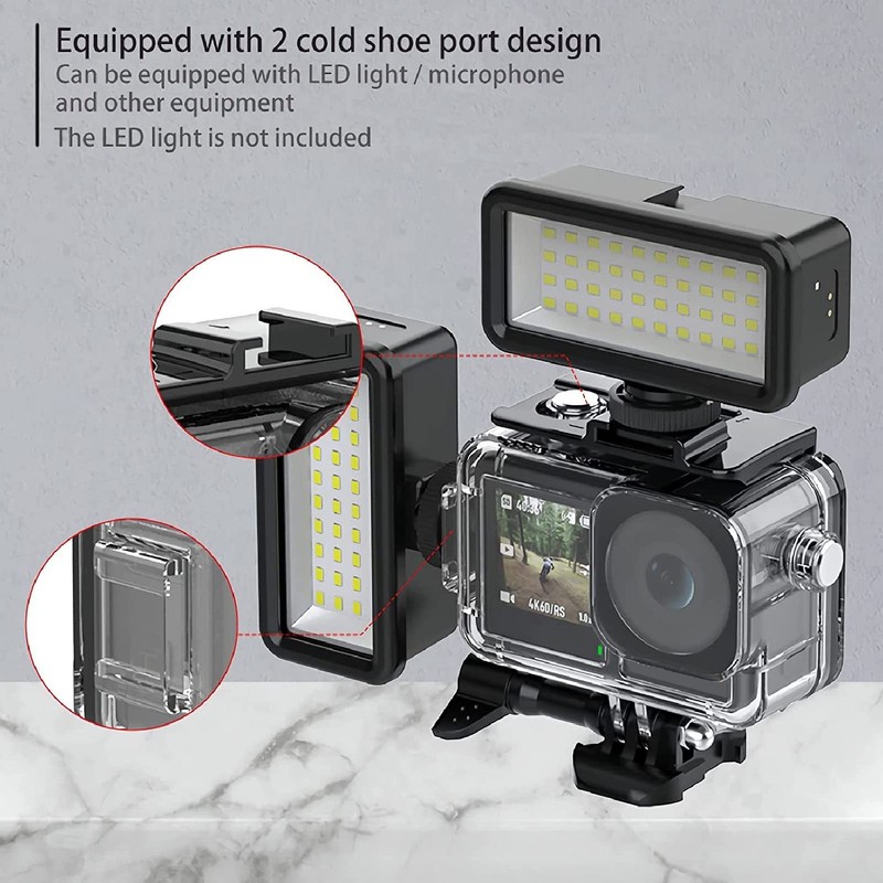 - Estuche de carcasa mejorado: 2 zapatas frías, diseño mejorado, con el adaptador, su cámara se puede fijar vertical u horizontalmente en un trípode, en el suelo o en una cámara digital. También se pueden fijar lámparas o smartphones con los accesorios adaptadores.
