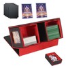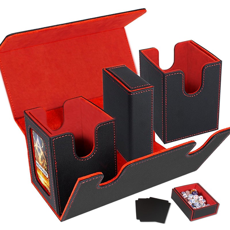 Card Deck Box for Trading Cards with Dice Storage, Double window separation Box Holds 200+ Single Sleeved Cards, PU Leather Magnetic Closure Storage Case for Magic Commander TCG CCG (Black&Red)