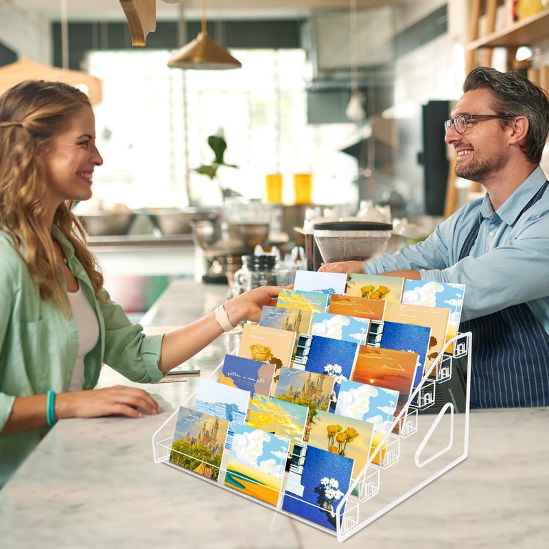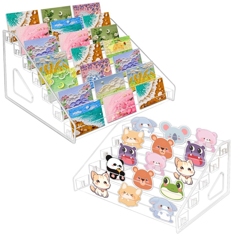 - Sticker Display Stand:This clear sticker display stand is made of sturdy acrylic to ensure durability and maximize product visibility. It is your first choice for displaying stickers, greeting cards, postcards at home events or vendor company trade shows. It is also an ideal solution for optimizing countertop space and promoting sales.