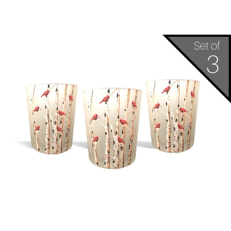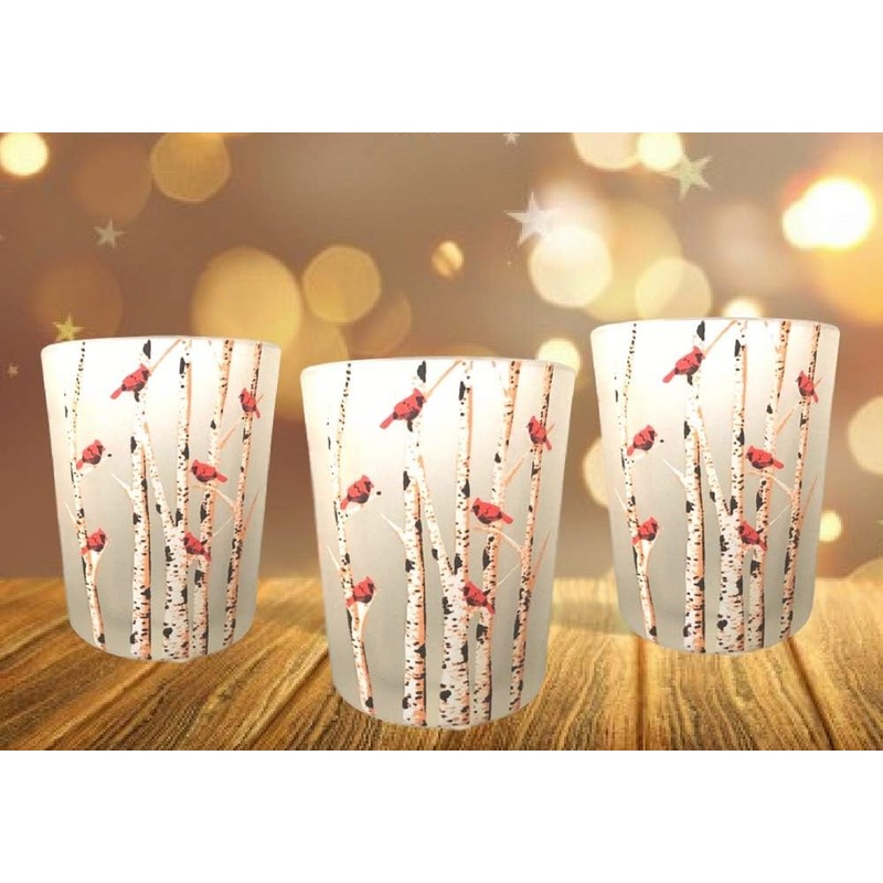 Cardinal Candle Votive Holders - Set of 3 - Frosted Glass - Red Cardinals on Birch Tree Branches