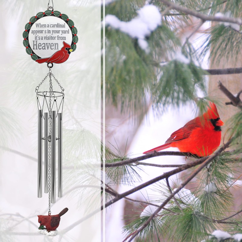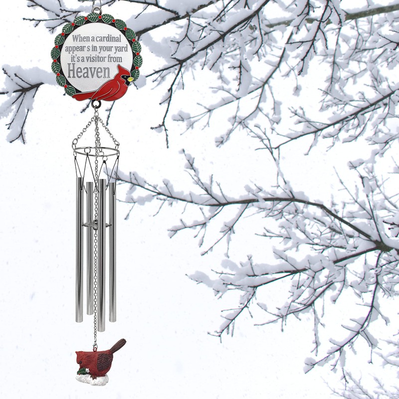 - CARDINAL MEMORIAL WIND CHIME. Create a serene and comforting atmosphere with our Cardinal Memory Windchime - a beautiful and meaningful tribute to a loved one who has passed. This sympathy wind chime features a hand-painted cardinal figure, enameled and embossed, attached at the bottom, representing the presence of a visitor from heaven. The windchime is adorned with the heartfelt saying, "When a Cardinal Appears in Your Yard It's a Visitor from Heaven," delicately embossed on its surface. Measu