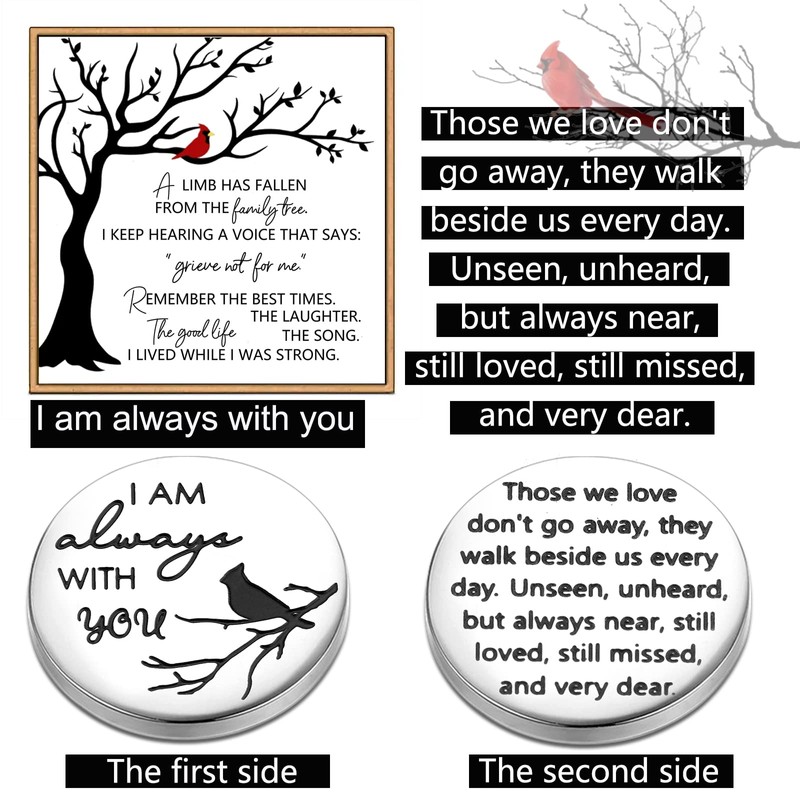- SYMPATHY MEMORIAL GIFT IDEA: Cardinal memorial coin, come with a piece of memorial poem card and a jewelry box, ready gift for giving. Those we love don't go away, they walk beside us every day. Unseen, unheard, but always near, still loved, still missed, and very dear.