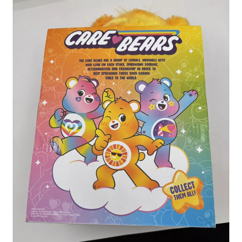 This is a 12" Care Bears Funshine Bear plush made of super soft polyester material. It is from the Care Bears franchise, part of the Care Bear Stare collection. The bear is multicolored with black eyes and comes with a bracelet. It is an original Care Bears item manufactured in 2024 in China. The plush bear is surface washable and suitable for ages 4 years and up.