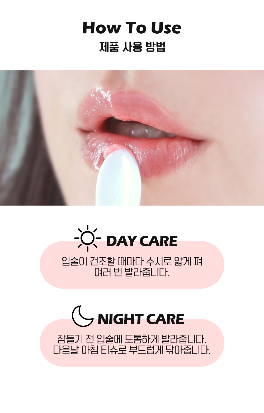 - How to use: 1. Before going to sleep, apply an appropriate amount thickly to cover the lips with your finger or a cotton swab. 2. The next morning, gently rub it off with a tissue or cotton pad.