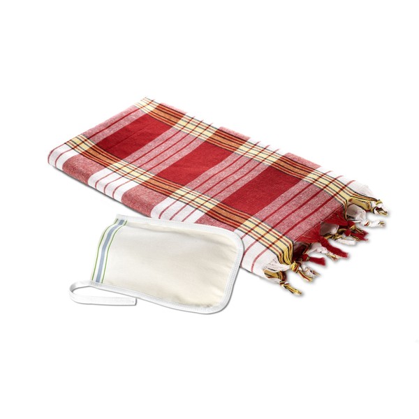 Carenesse Hamam Set, 1 Hamam Cloth Checked Red and 1 Exfoliating Glove Solid