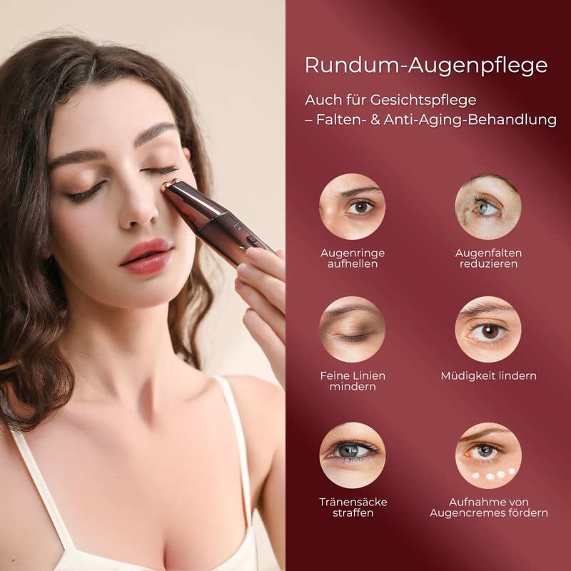- Anti-ageing effect for eyes and face: Specially designed to treat common eye problems such as eye bags, swelling, fine lines and tired skin. At the same time, the device supports holistic facial care, for visibly smoother, firmer and more radiant skin with regular use