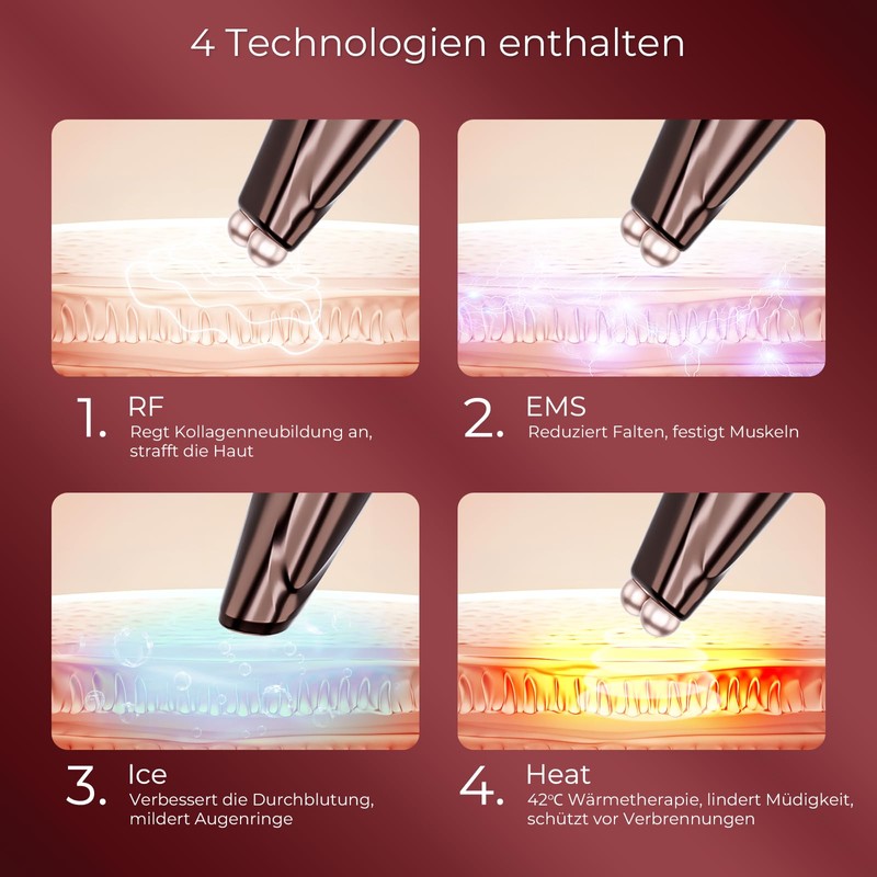 - 【RF:Radio frequency for collagen stimulation】The RF function penetrates deep into the skin layers with soothing heat, activates collagen formation and regenerates skin tissue. This radio frequency device is ideal for signs of ageing to smooth wrinkles, increase elasticity and improve skin structure in the long term