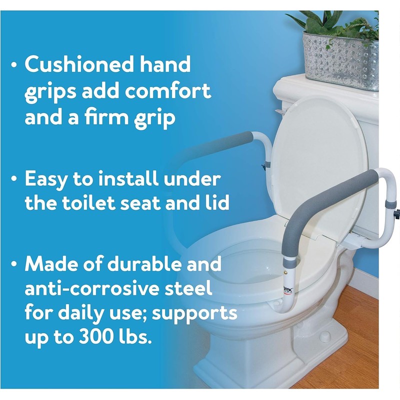 - Very Safe And Sturdy: Handicap grab bars for toilets that allow you to sit safely or stand at the toilet. Perfect for those who are a fall risk and need a toilet safety rail in the bathroom or those who need a handicap compatible toilet. Holds 300lbs.