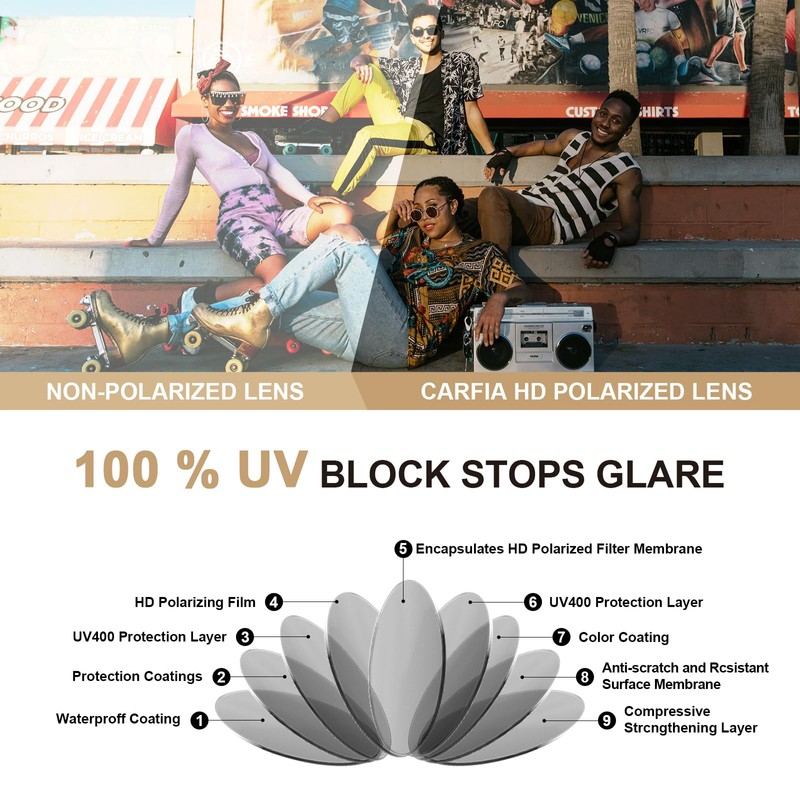 - Womens Sunglasses Polarized UV Protection - Our polarized womens sunglasses are effective UV filter, since lens block 100% harmful UVA/UVB rays up to 400nm then protect eyes from squinting, fatigue, wrinkles. Polarized TAC lens also eliminate 99% horizontal glare, offer you the highest available light reduction for the richest colors, sharpest contrast and improved clarity vision.