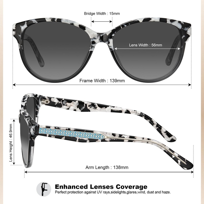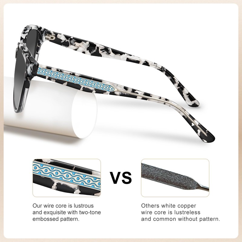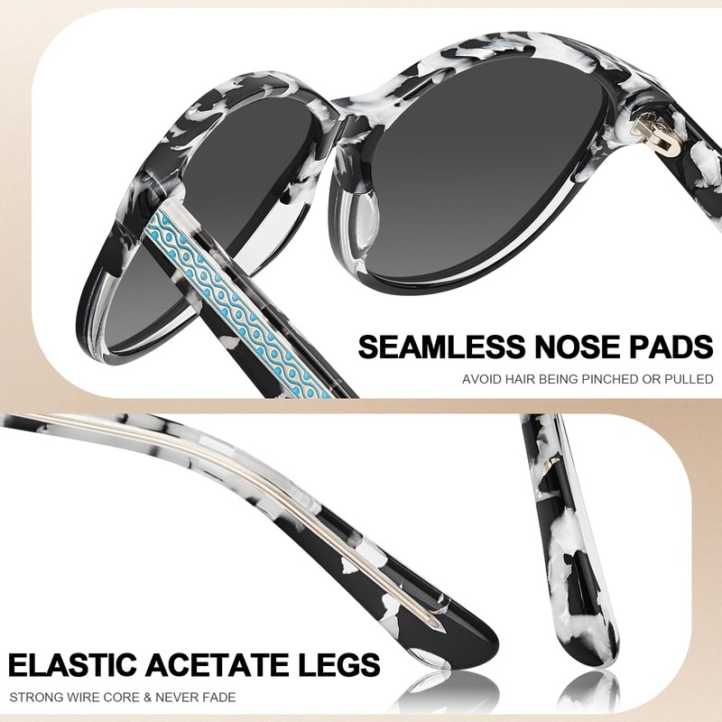- Acetate Marbled Tortoise Frame Woman Sunglasses - Our black white sunnies are made of Italy handpolished acetate material. Compared with cheap peeling plastic frame whose color are sprayed on, our glossy frame retains color brightness impeccably over time because its hue is natively embedded in material. So avoid from fading, peeling, yellowing or other discoloration. Hypoallergenic aceteate also resistant to cosmetics/sweat corrosion.