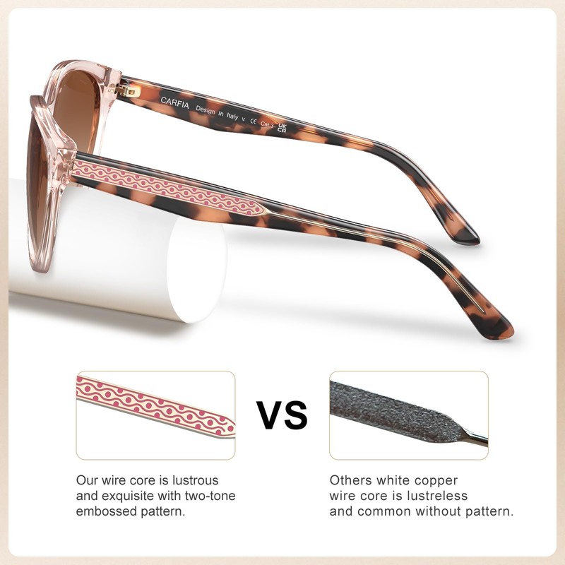 - Retro Fashion Clear Sunglasses for Women - Built with firm three-barrel metal hinges, shatterproof lens & ergonomic seamless nose pads, our cat eye women's sunglasses offer ultimate strength and all-day wear comfort. Arms are decorated with engraved two-tone metal wire core, which is exclusive and luxurious on market. As well, arms are easy to open and close with moderate smooth screw tightness.