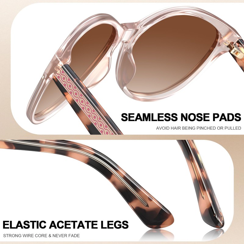 - Acetate Clear Pink Frame Woman Sunglasses - Our sunnies are made of Italy handpolished acetate material. Compared with cheap peeling plastic frame whose color are sprayed on, our glossy frame retains color brightness impeccably over time because its hue is natively embedded in material. So avoid from fading, peeling, yellowing or other discoloration. Hypoallergenic aceteate also resistant to cosmetics/sweat corrosion. Elastic arms rest comfortably behind ears without squeezing head.