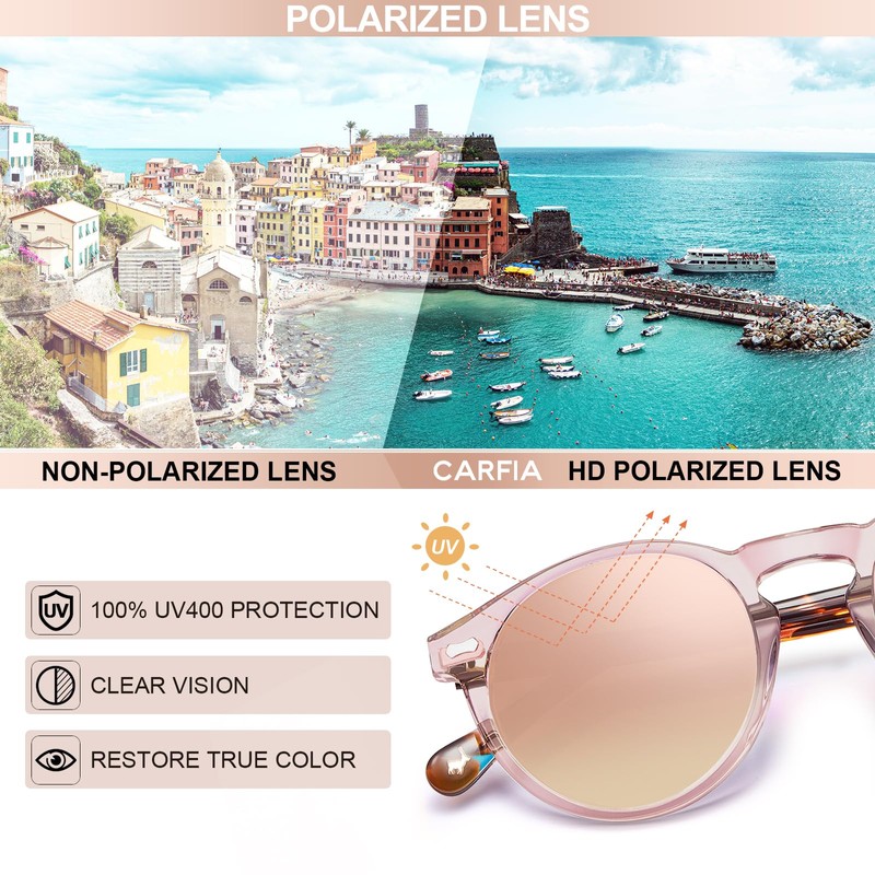 Benefits of Our Polarized Lenses: Eliminates Glares, Increases Visual Clarity, Enhanced Contrast and Reduces Eye Strain. Carfia Polarized Sunglasses, the result of 30 years of innovation and research, blocks more than 99% of the reflected lights, reduce the brightness of shiny surfaces, like chrome, and large bodies of water, to improve your safety, comfort and performance when your are driving, or other outdoor activities.
