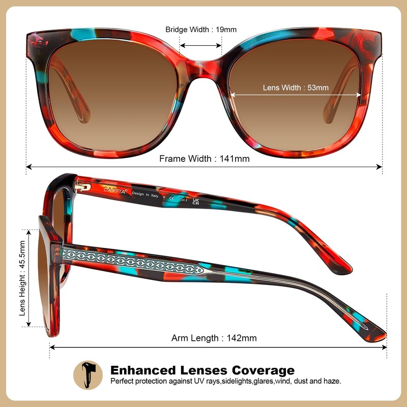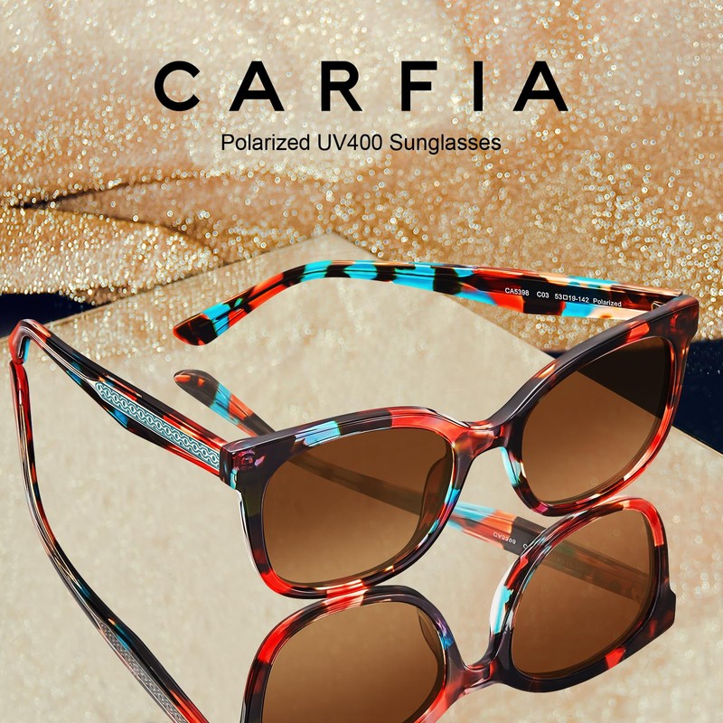 CARFIA sunglasses are of excellent quality, with high-quality polarized lenses, a very fashionable and elegant design, a very beautiful finish, a cateye shape, a branch of colorful print effect, and a gorgeous touch. Good protection and better sunlight visibility. Very comfortable to wear all day. A very beautiful gift box with a unique black leather protective case and a small cleaning cloth. A very cost-effective and great gift idea, perfect for a girl's unique style.