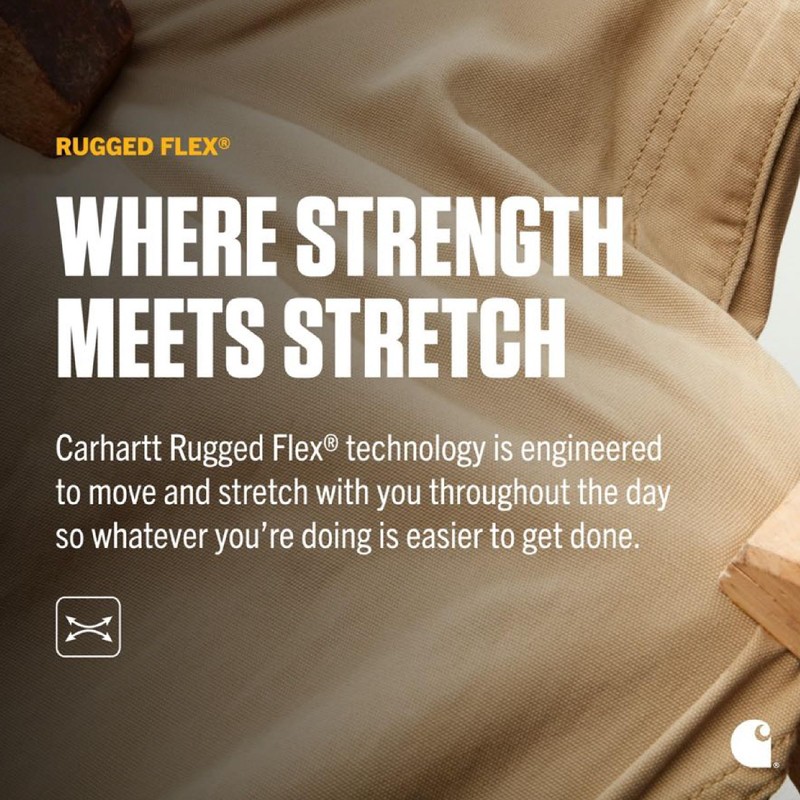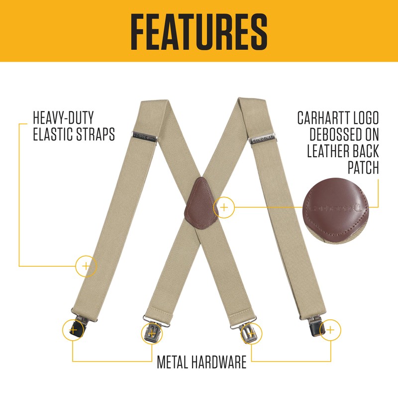- Two-inch, heavy-duty elastic suspender straps with contrast color stripe down the center. Metal strap-length adjusters. Carhartt logo debossed on leather back patch. Rugged Flex stretch technology for ease of movement