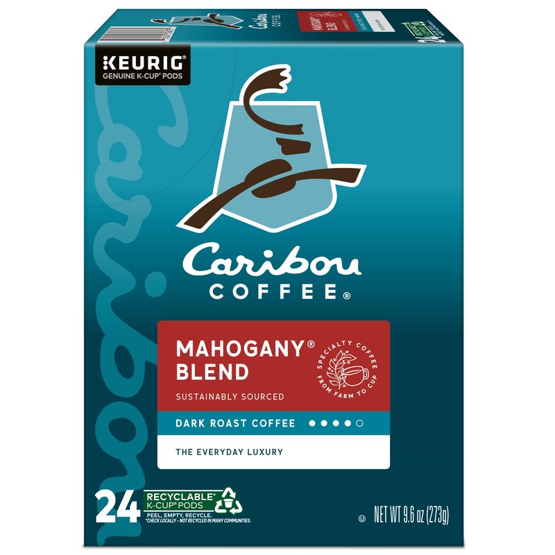 - Available in convenient K-Cup Pods, this mahogany coffee from Caribou Coffee combines bold molasses, spices and semi-sweet chocolate flavors for a robust cup. Best of all, you'll never need to measure grounds - it's been done for you.