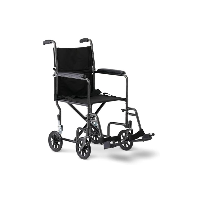 Caring Folding Transport Wheelchair with Swing-Away Footrests, Full Length Arms, Lightweight Carbon Steel Frame, 17” Padded Seat, Portable for Adults & Seniors, 250 lb Capacity, Black