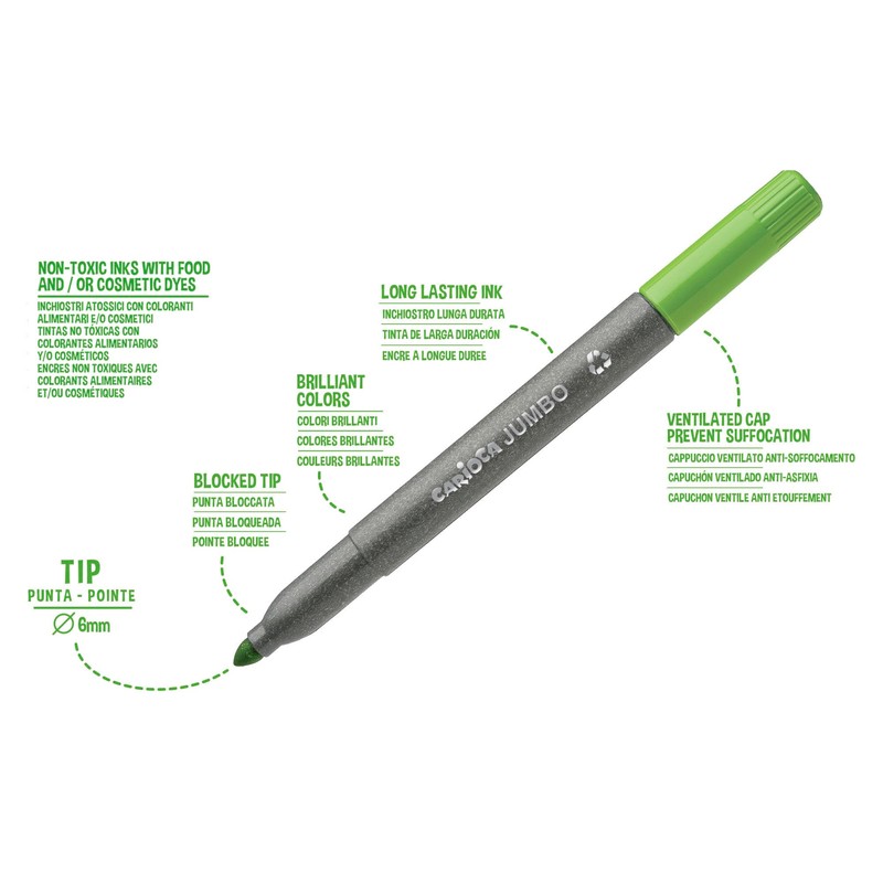 - Jumbo Markers: Super washable marker box with 6mm thick and blocked tips. Super washable ink that can be removed from the skin and most textiles with soap-free water