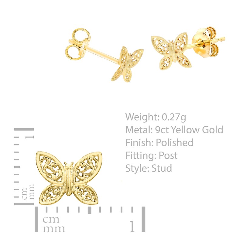 - THE FINER DETAILS: This is a 9ct Yellow Gold 7mm x 6mm Filigree-Butterfly Stud Earrings