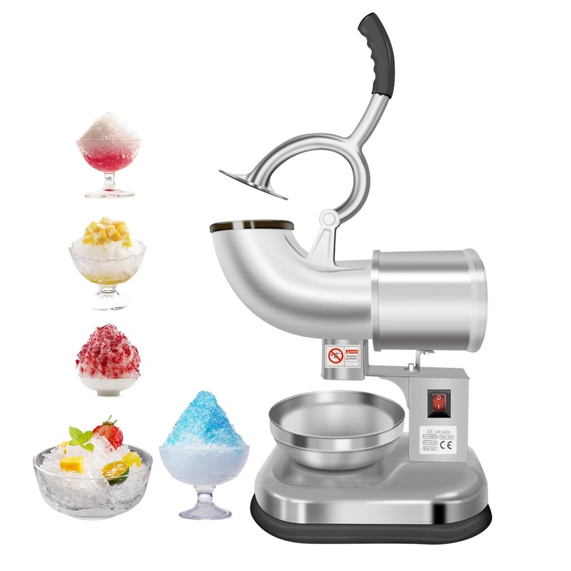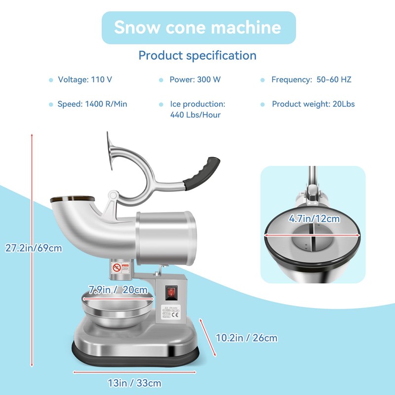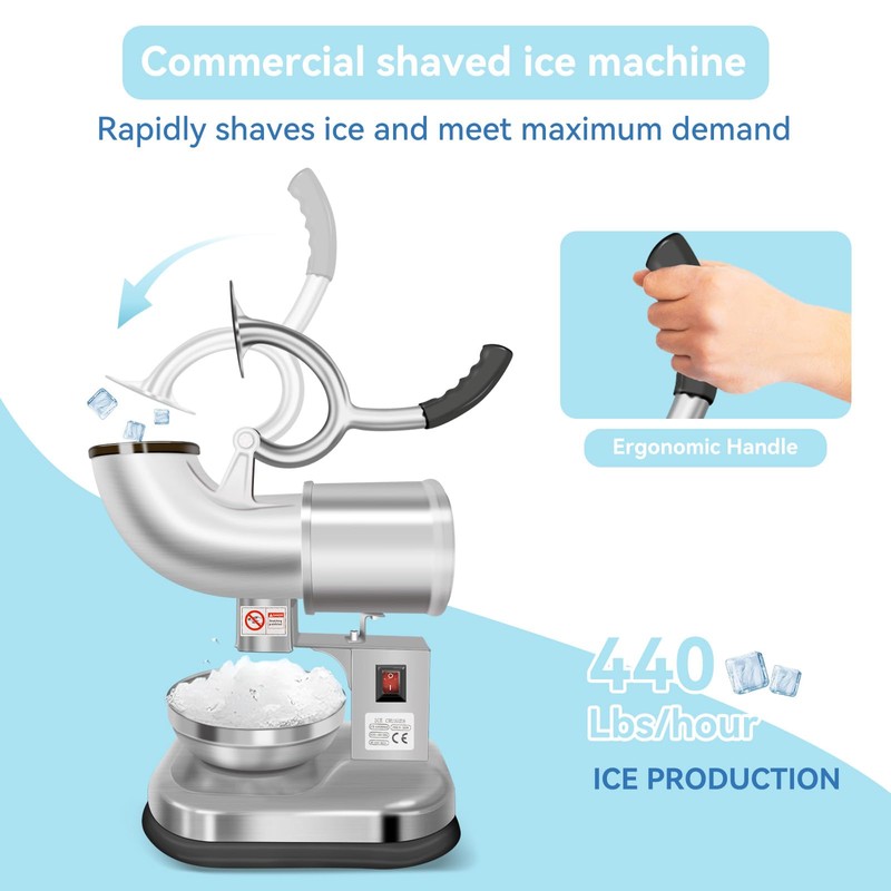 High Crushing Efficiency:The electric ice shaver features sharp stainless steel 2 blades,which can effortlessly turn ice cubes into fluffy snow-like texture in seconds. 300W powerful electric starter motor brings highly efficient performance,crushing up to 440 lbs(200kg) of shaved ice per hour to meet large demand.