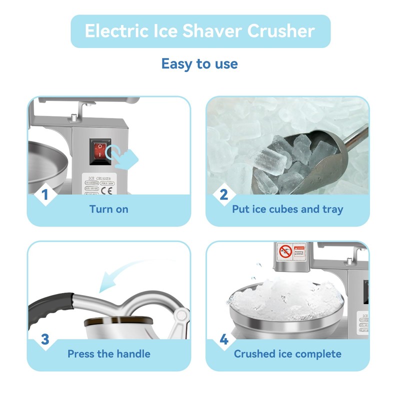 User-friendly Design:The electric dual blades ice crusher features ergonomic handle for more comfortable use.The disc perfectly fits the ice inlet barrel, and its cover avoids splashing during the ice crushing process. Stable and solid base to ensure stability during operation. On/Off switch has been shielded with a waterproof cover to guarantee safe operation.