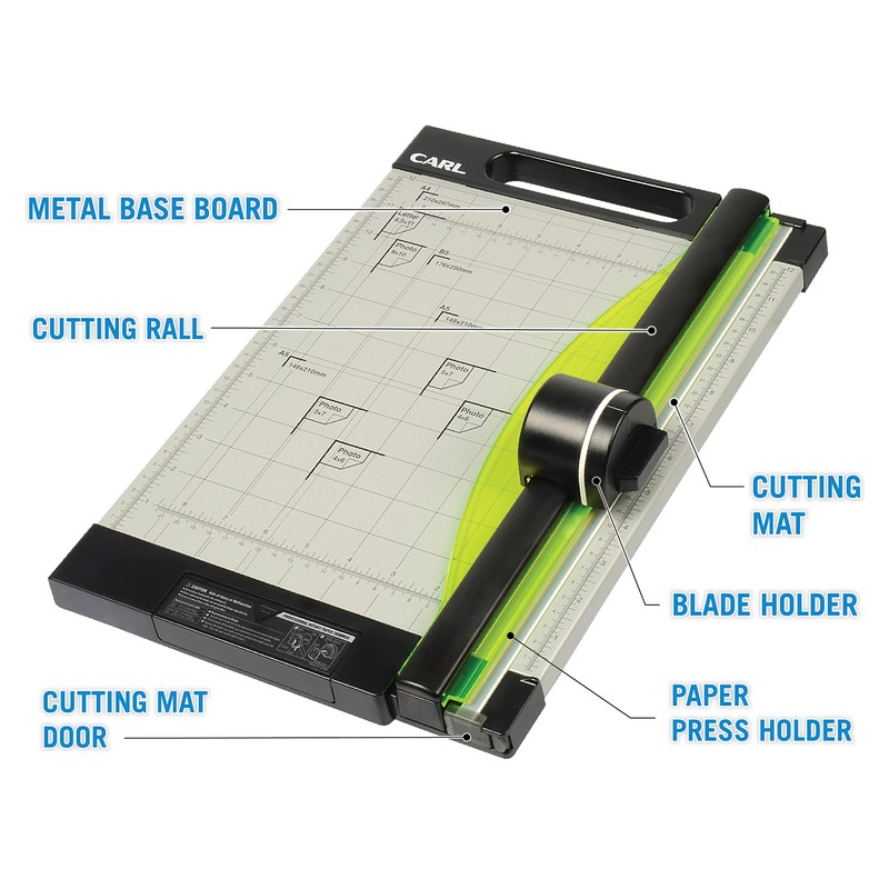 Green machine 12 inch professional rotary trimmer. Cutting is easy and accurate, thanks to the luminous paper guide made from light-harvesting acrylic. Stainless steel No-touch safety blade cuts standard paper, card stock, photos and more. Sturdy metal base is calibrated and features preset measurements for common-size items. Updated graphics, rulers and grid. Handy compartment stores extra blades and cutting mats. Limited lifetime warranty (excludes blade and cutting mats).