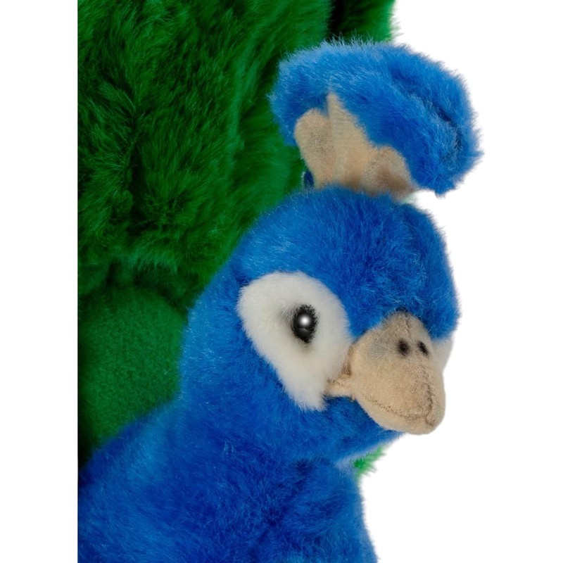 - The plumage on the bird's body is blue plush. The mounted wheel is green and has the famous peacock patterns embroidered on it, giving the peacock a lifelike look. There are white areas on the head, legs, beak and on the crest the bird wears beige. The colour of the safety eyes is black.