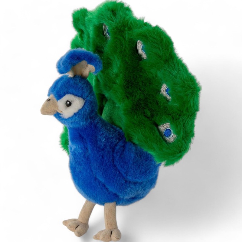 - High quality peacock as a cuddly toy. The blue bird from the pheasant family has opened its green plumage.