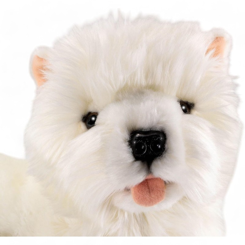 - The fur of the stuffed dog is white. The black nose and the open mouth with the tongue hanging out are prominent. The colour of the safety eyes is brown.
