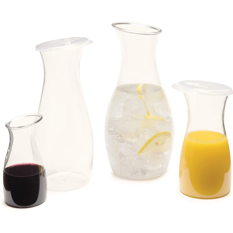 The 1.5 liter Carlisle cascata carafe is perfect for water, juice or wine. The ergonomic shape is easy to hold and the angled rim provides a drip-free pour. Capacity marks make portion control easy. The shatterproof polycarbonate looks like glass. Solid and hinged style snap-on lids are available from Carlisle (sold separately). Dishwasher safe and NSF listed.