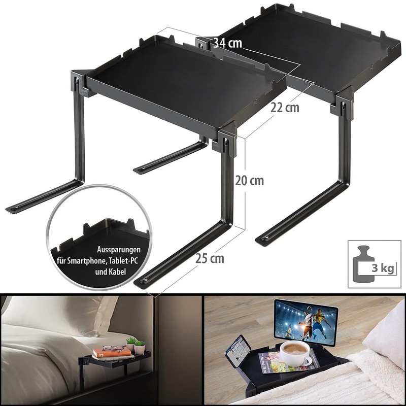- 2 folding bed shelves, each including bracket and instructions in German. Night shelves – also relevant or suitable for: laptop. When ordering individually, we send the item directly in the original product box that is safe for shipping. This saves packaging waste and protects the environment.