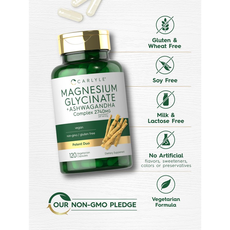 Carlyle Magnesium Glycinate with Ashwagandha | 2,740mg Complex | 120 Vegetarian Capsules | Potent Duo | Non-GMO and Gluten Free Supplement