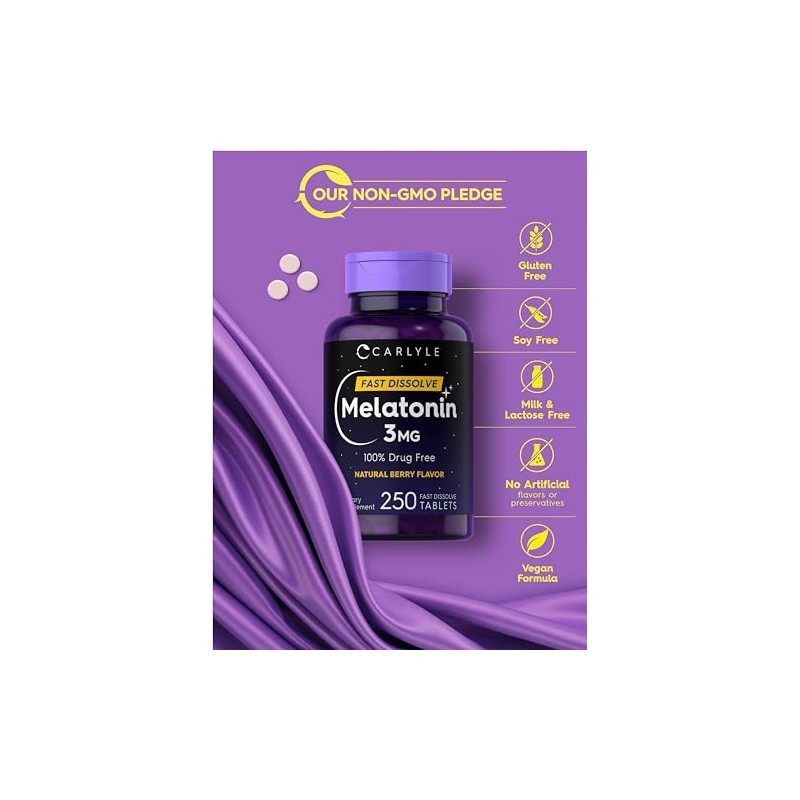 Carlyle Melatonin 3mg Fast Dissolve Tablets | 250 Count | Low Dose and Drug Free | Vegan, Non-GMO, Gluten Free