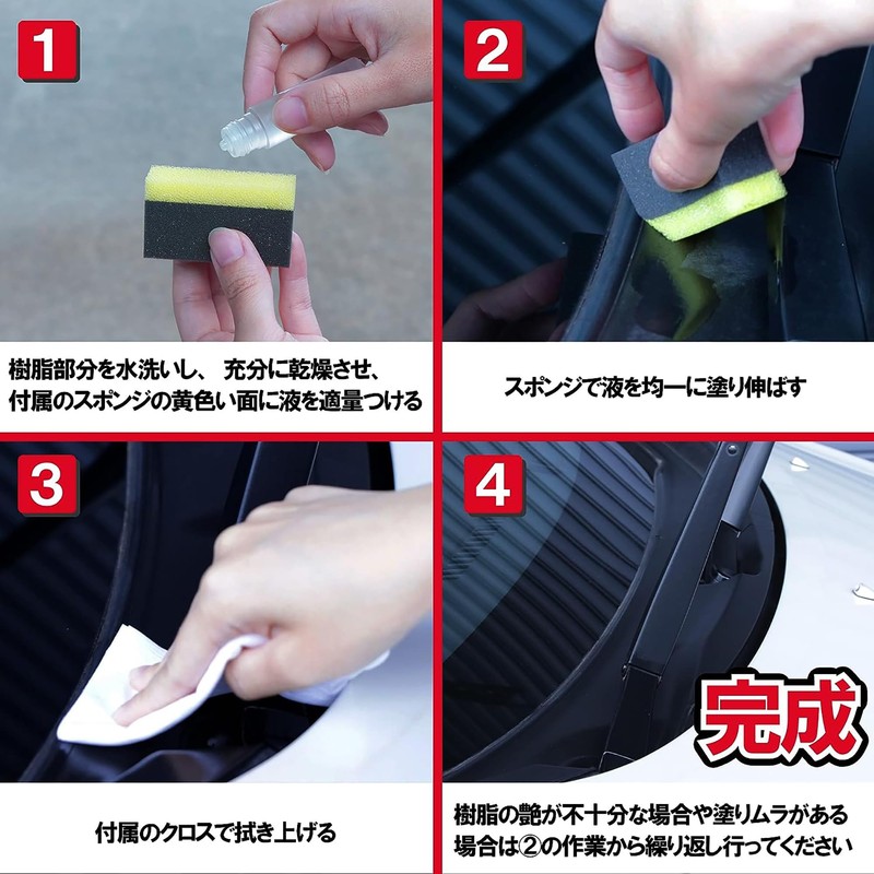 - 2 pack for plenty of use This set is recommended for SUVs and croco cars with a large black resin area. Set Includes: Resurrection & coating agent 0.3 fl oz (8 ml) (1 dose) x 2, Installation sponge x 2, Cleaning cloth x 2