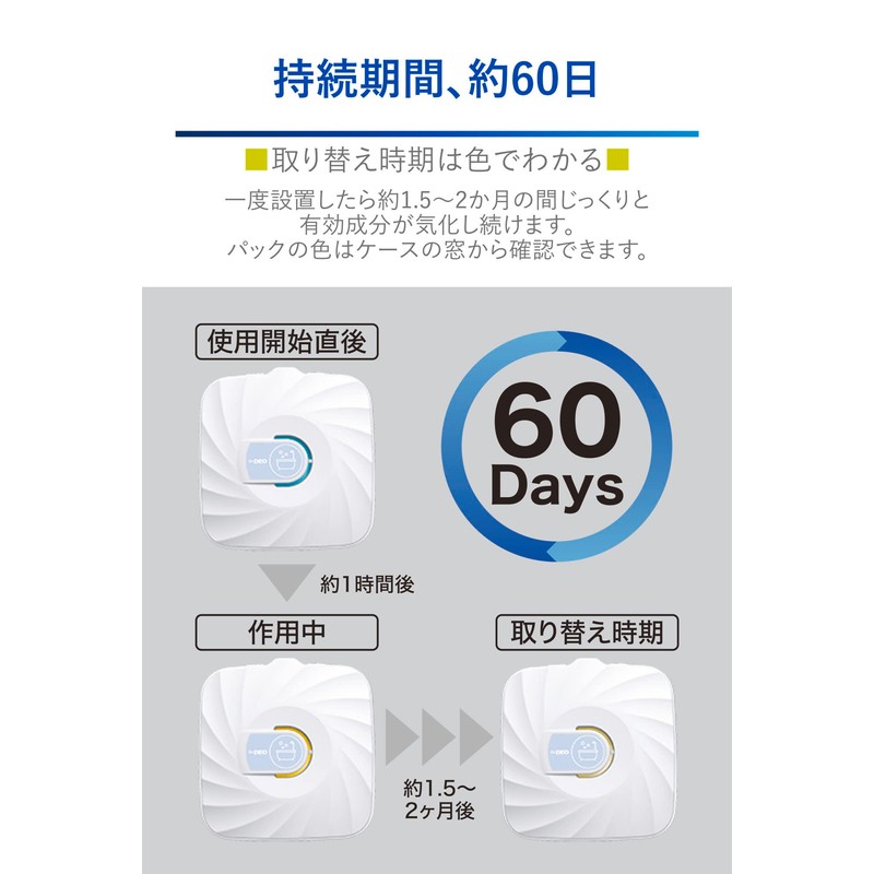 - Sustainable Period: Once installed, the active ingredients will continue to vaporizate for approximately 1.5 to 2 months. No product maintenance is required during that time. It is also designed so that you can see when you change the color. Effects and sustainability may vary depending on the usage environment