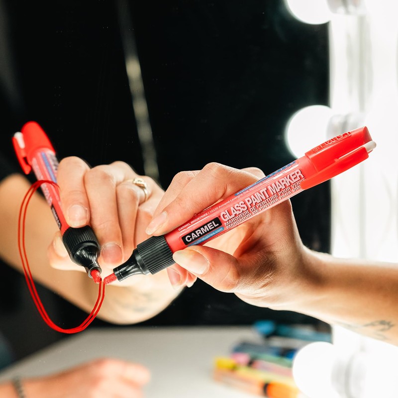 - GLASS PAINT MARKER - This marker applies vivid paint to create artwork on restaurant windows, car windshields and other non-porous flat surfaces. This temporary paint marker dries quickly and is removable from non-porous surfaces with a damp cloth and glass cleaner.