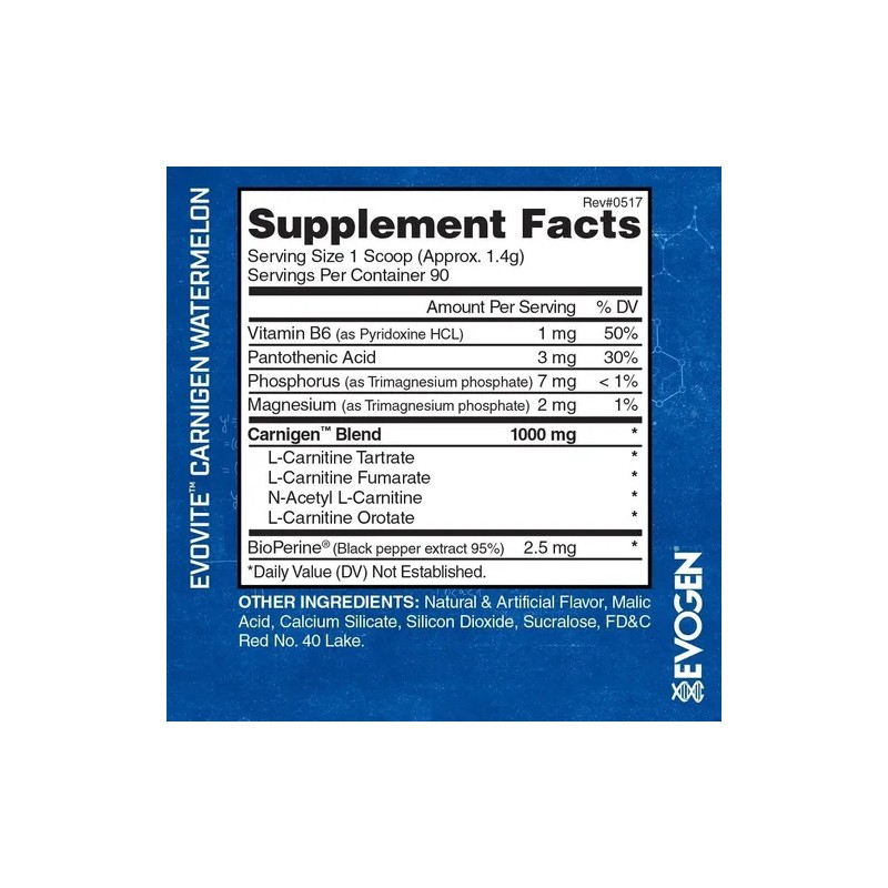 Evogen Nutrition se distingue por su innovación y complementos de alto impacto. Carnigen es una mezcla de carnitina de alta calidad y sin estimulantes, que utiliza tecnología avanzada de formulación para transformar la grasa en energía. Para potenciar la absorción y activar la matriz precisa de carnitina, Carnigen incluye vitaminas, minerales y elementos que mejoran la biodisponibilidad. Es la solución ideal para la reducción de grasa antes del cardio o el entrenamiento. Rambod ha creado una solución óptima de carnitina que combina cuatro tipos de carnitina para llevar tu físico a un nivel superior. Además, tiene un sabor agradable.