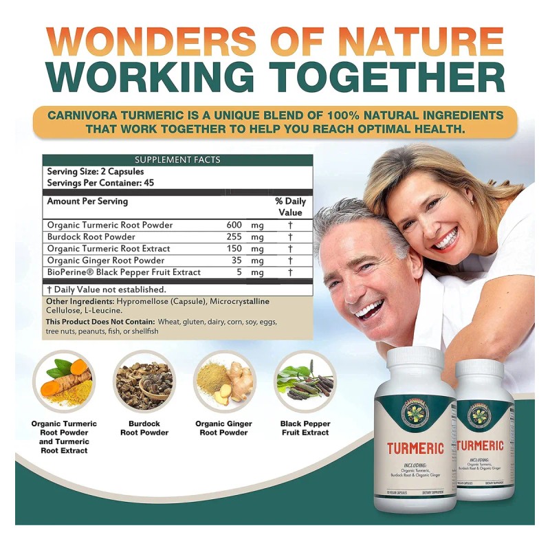 - COMBO VEGI-CAPS + CÚRCUMA: Lleva tu salud al siguiente nivel con esta potente combinación Carnivora. Siéntete más saludable y fuerte. El combo puede ayudar a fortalecer el sistema inmunológico y apoyar articulaciones y digestión. Incluye 1 frasco Vegi-Caps (100 cápsulas) y 1 frasco Carnivora Cúrcuma (90 cápsulas).