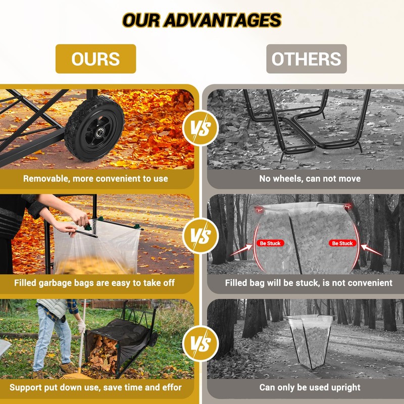 - Supports Lay Down to Use- Our metal garden garbage bag holder has a push hand designed for easy push. At the same time, it can be laid down to use, which can collect leaves much more efficiently, save energy, and help your outdoor projects easy to handle.