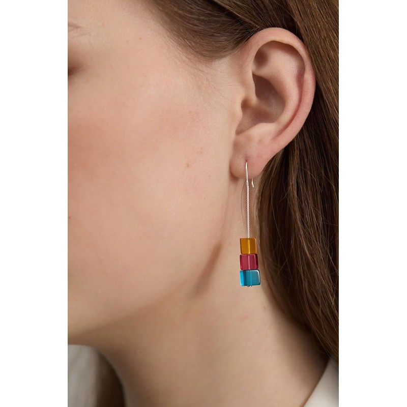 - Design: Minimalist yet playful, this earring features three crystal-cube charms suspended from a sleek silver chain, creating a dynamic and eye-catching silhouette.