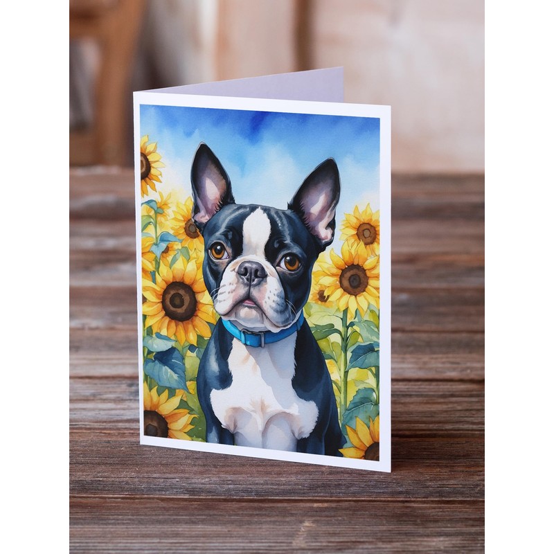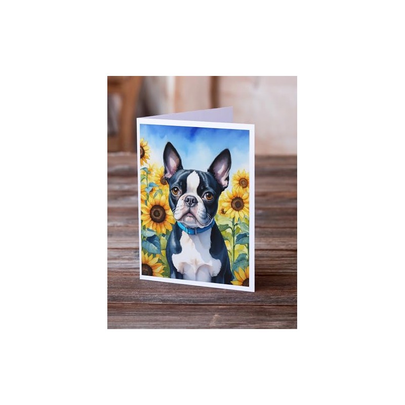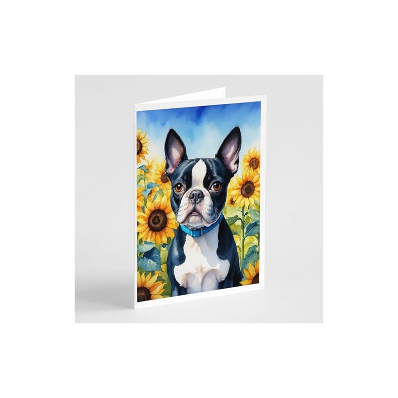 Caroline's Treasures Boston Terrier in Sunflowers Greeting Cards Pack of 8 Blank Cards with Envelopes Whimsical A7 Size 5x7 Blank Note Cards