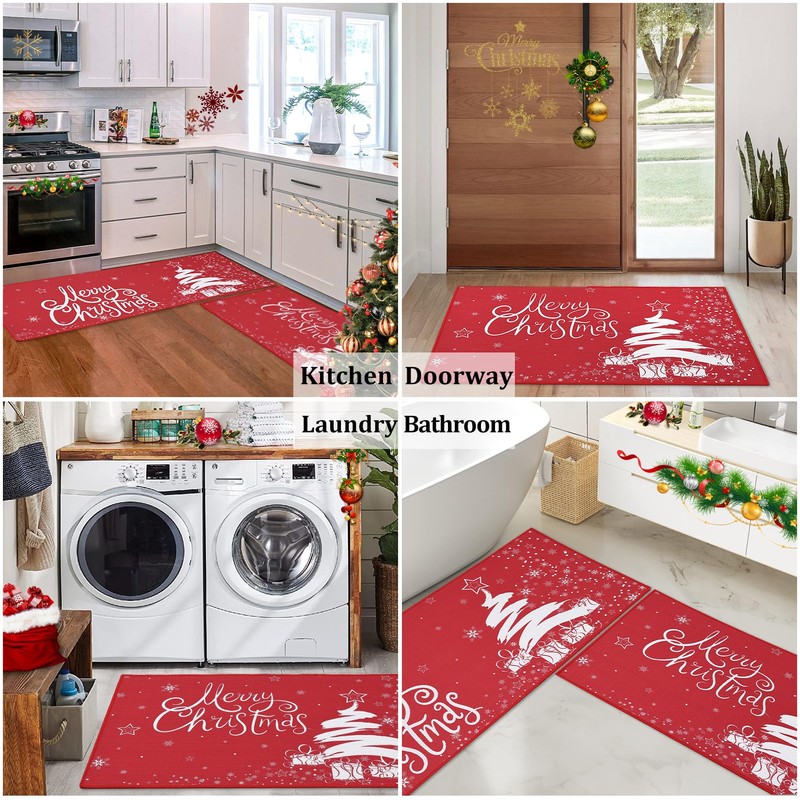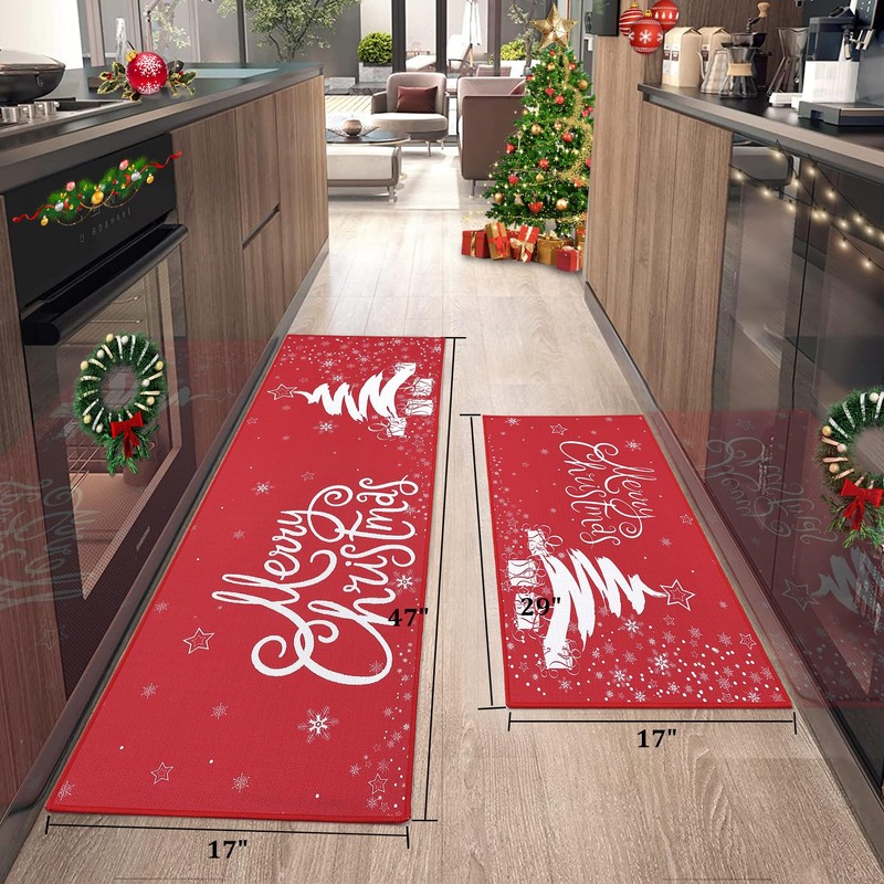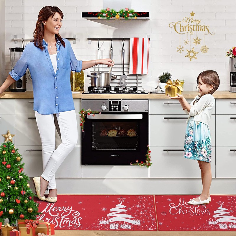 • Suitable Size: Package includes 2 pcs Christmas kitchen rugs printed with "Merry Christmas" blessing words, Christmas tree and gift, new printing technology applied stands wear and tear and keeps vivid color for a long time. Size:17"x 29"+17"x 47", it can be applied in most households.