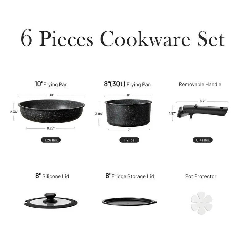 - 10" Frying Pan, 8"(3QT) Saucepan, Detachable Handles, 8" Silicone Lid, 8"Storage Lid, Pan Protectors.